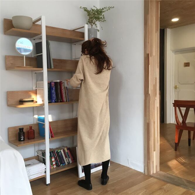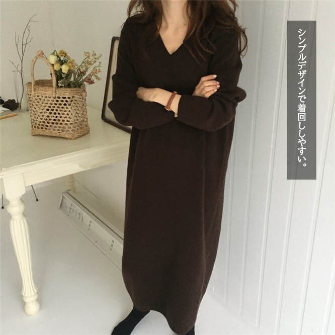 新作 レディース ロング ニット ワンピース リブニット 長袖 フリー 秋冬 Vネック 長袖 伸縮性 無地