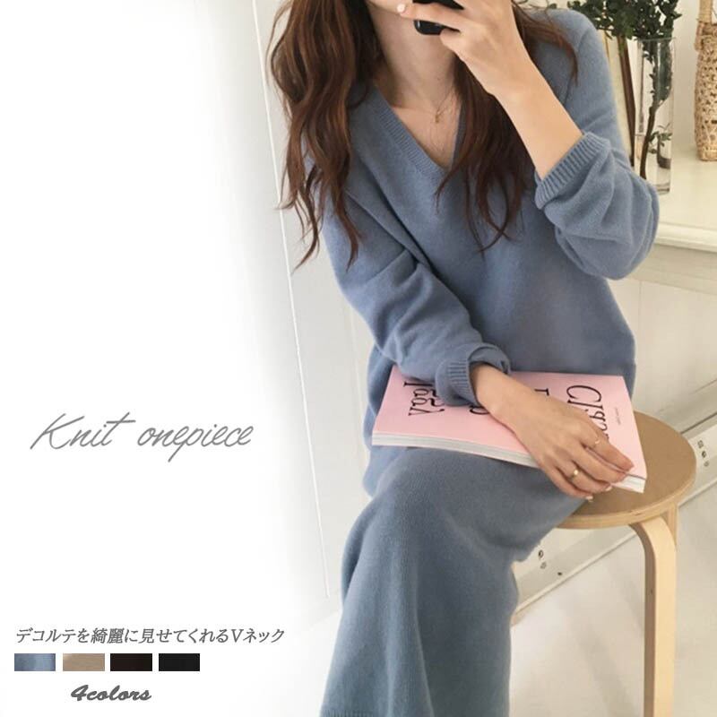 デコルテを綺麗に見せてくれるVネック ニットワンピース