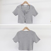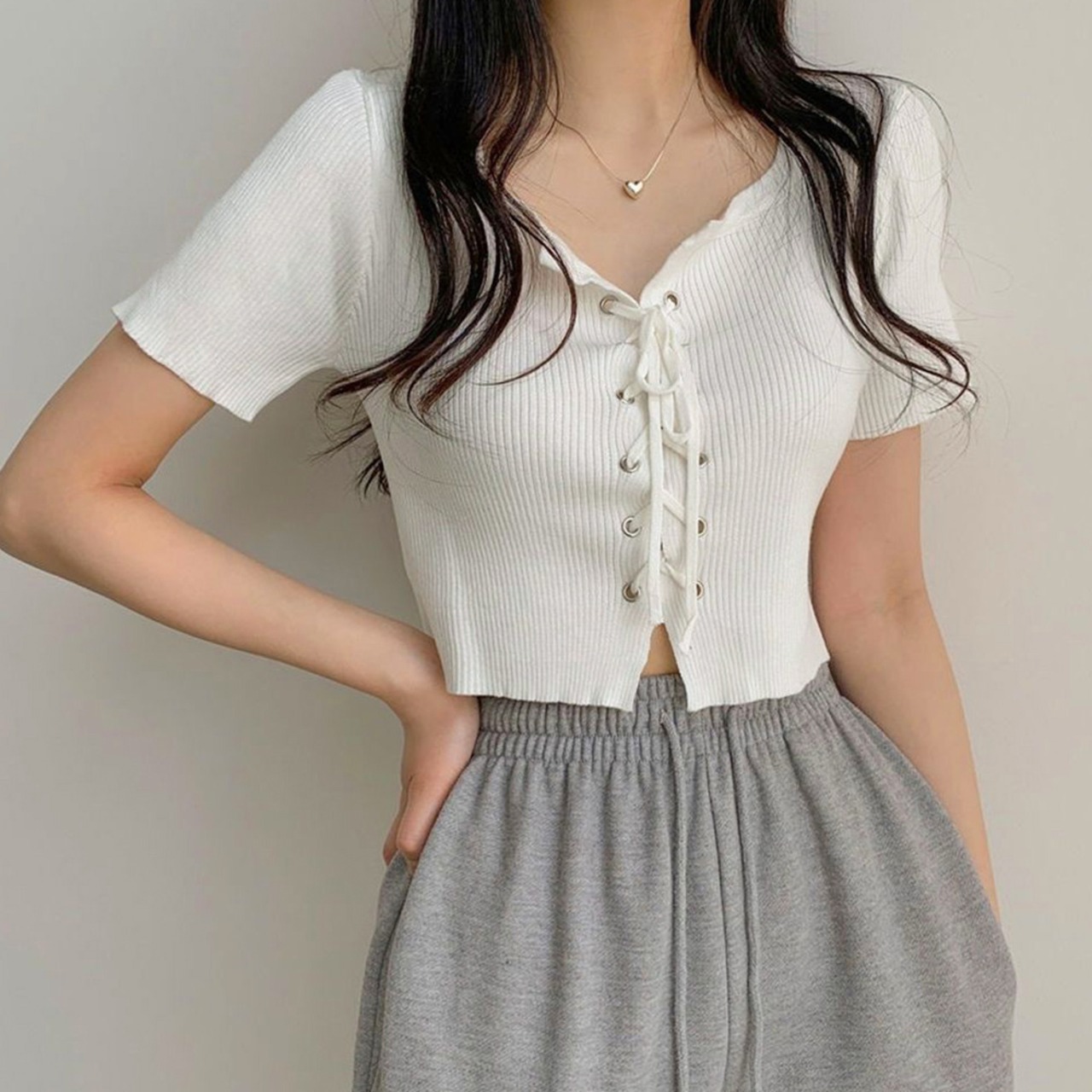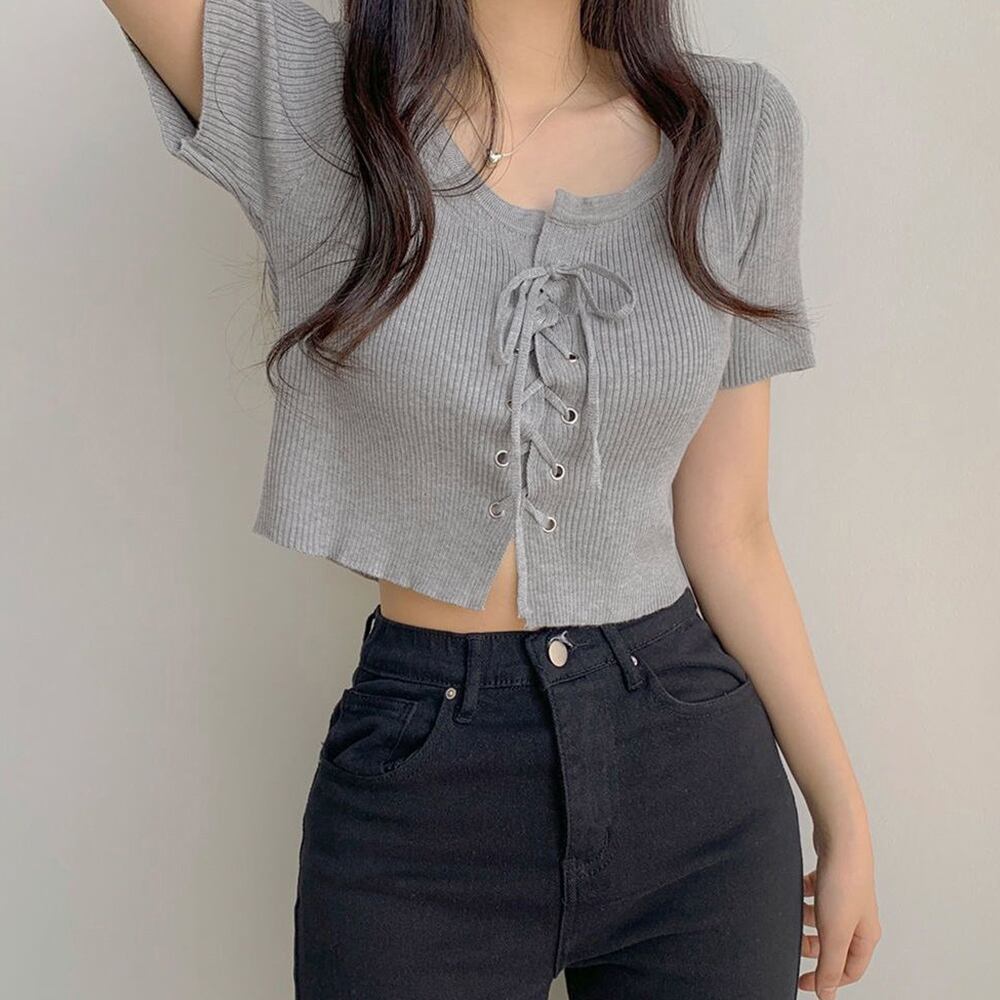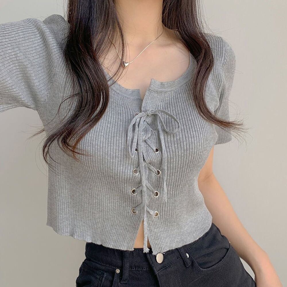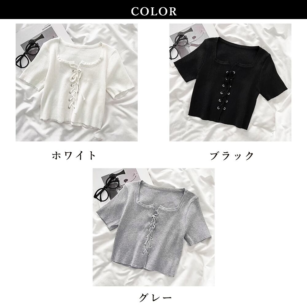 レースアップ プルオーバー 半袖クロップド丈 ニットカットソー ラウンドネック 韓国春夏コンパクトニットソー カジュアル