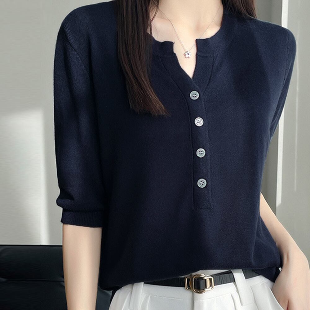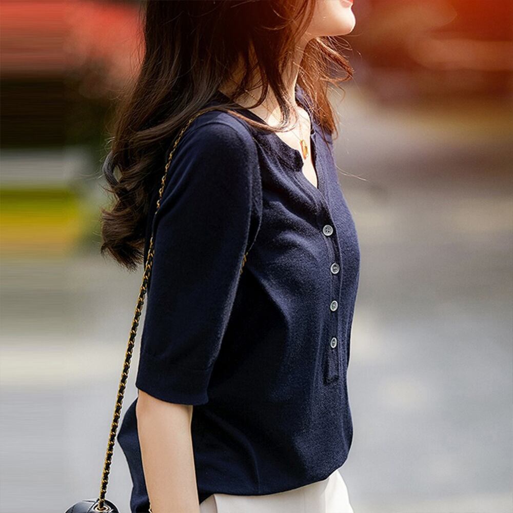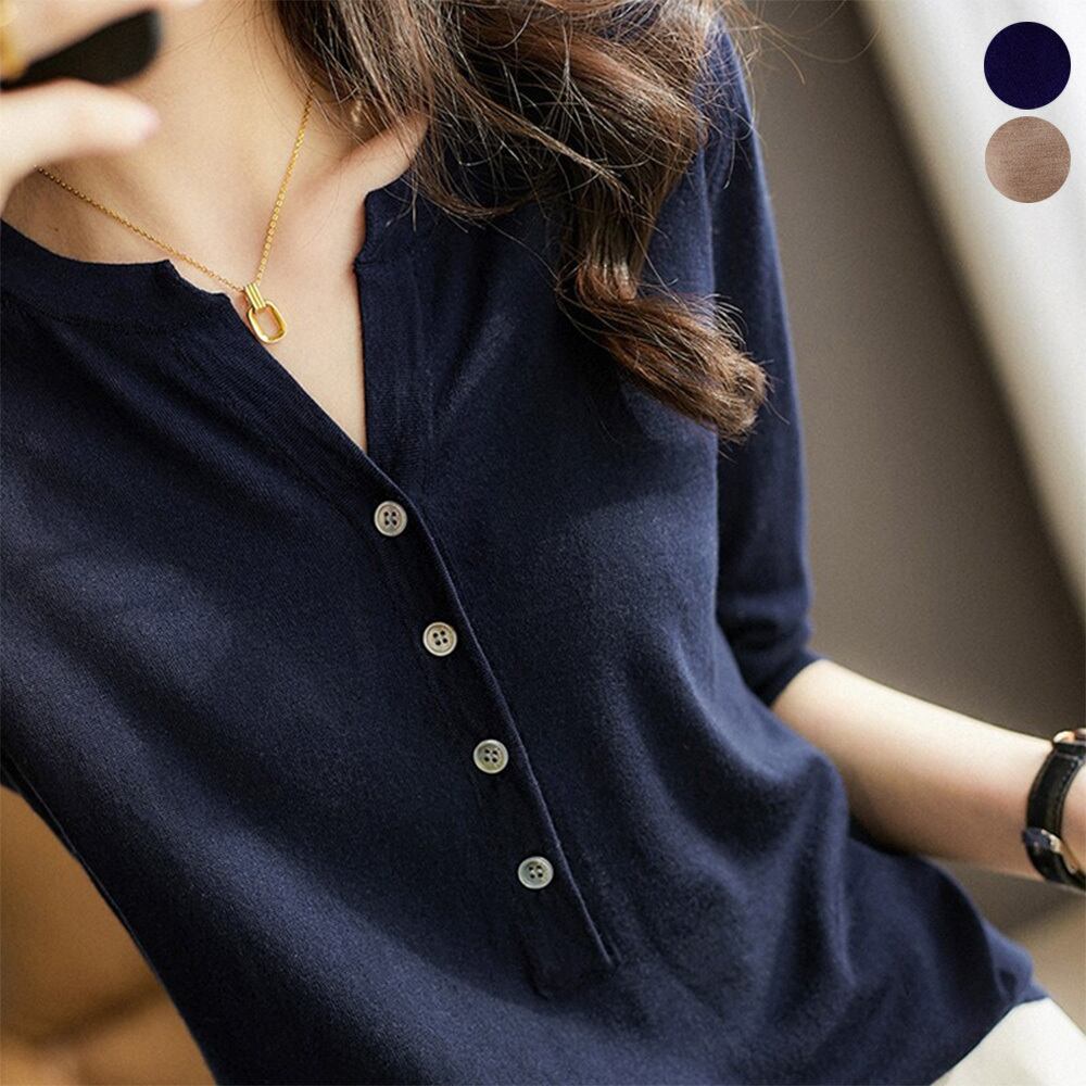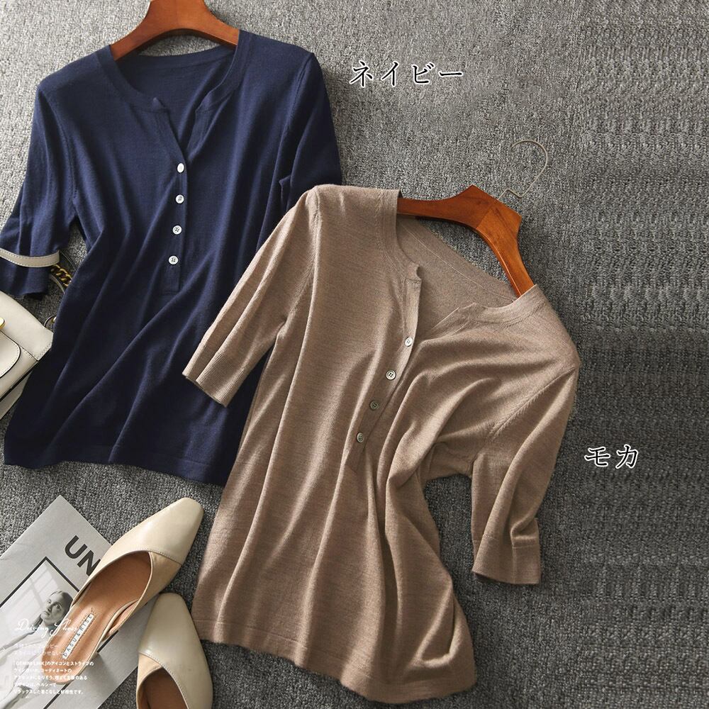 レディース ハーフボタン ニットカットソー 5分袖 薄手プルオーバー 大人可愛い 無地春秋夏トップス 半袖 着やせニット