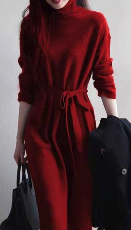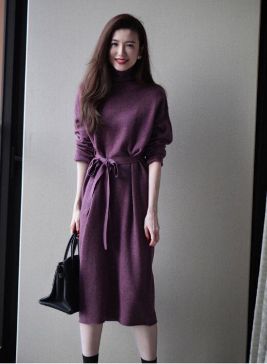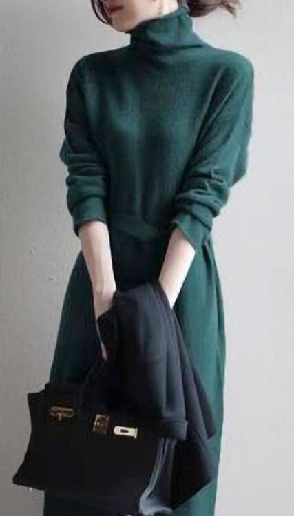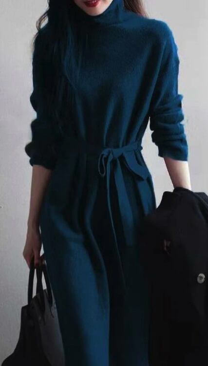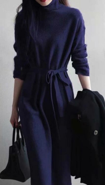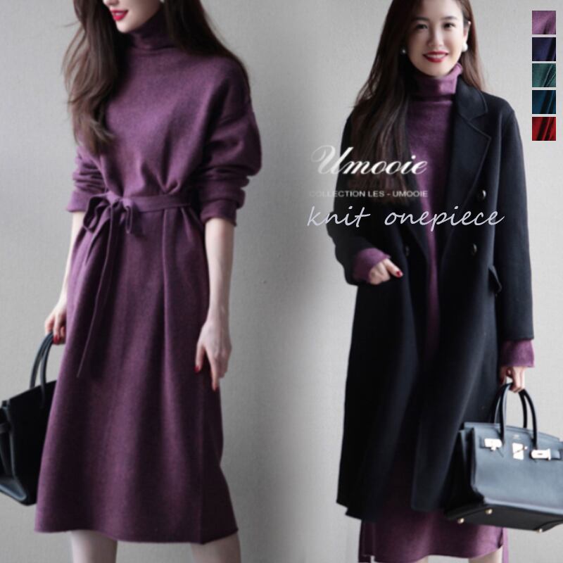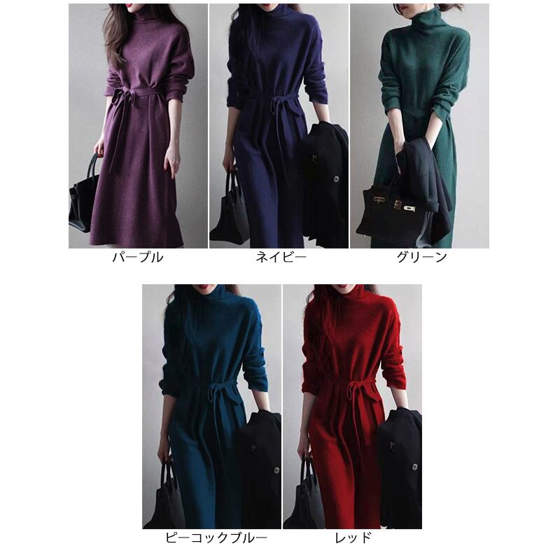新作 レディース ワンピース ロング 長袖 タートルネック ニット Aライン オシャレ 秋冬 膝丈 ミディ丈