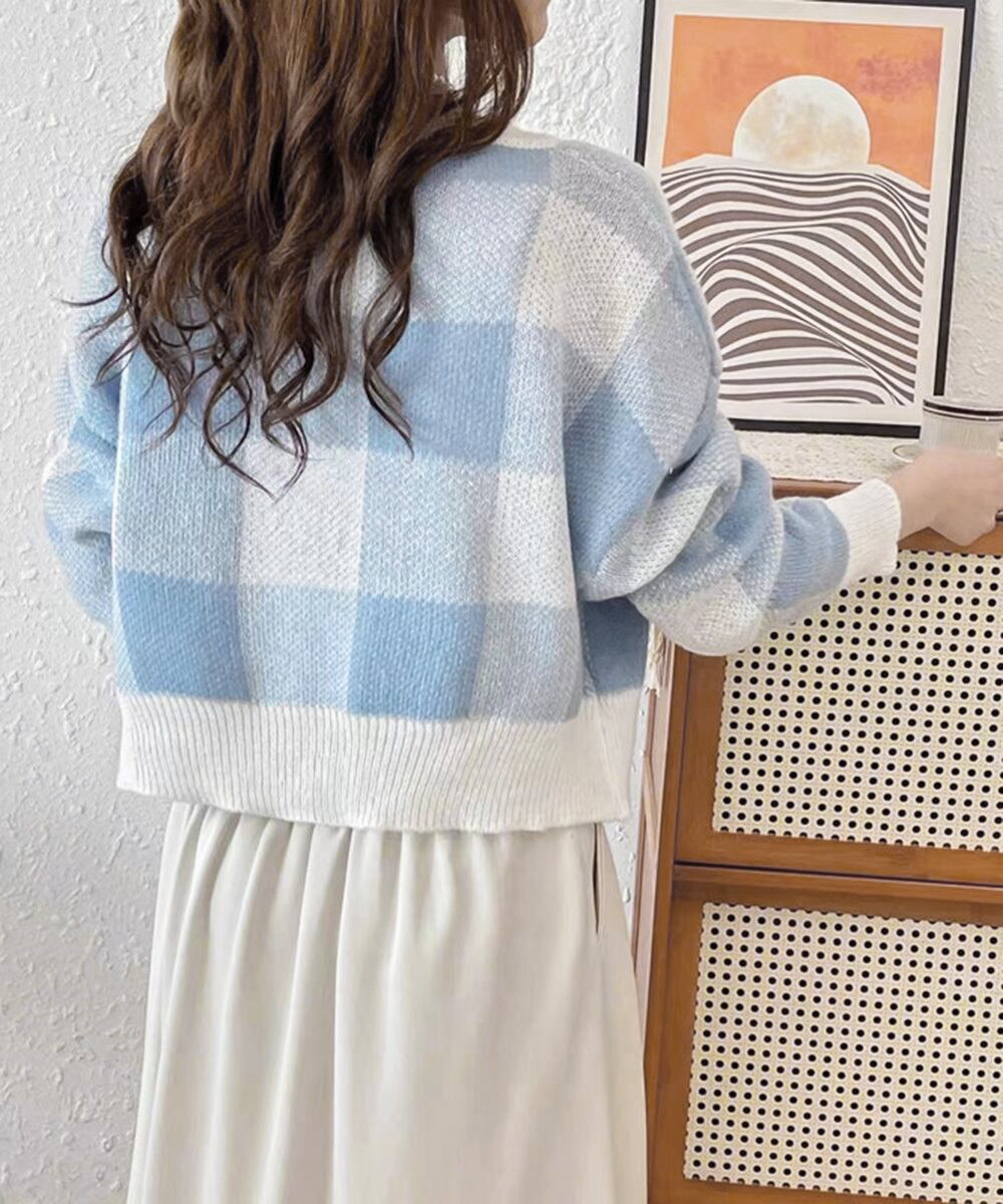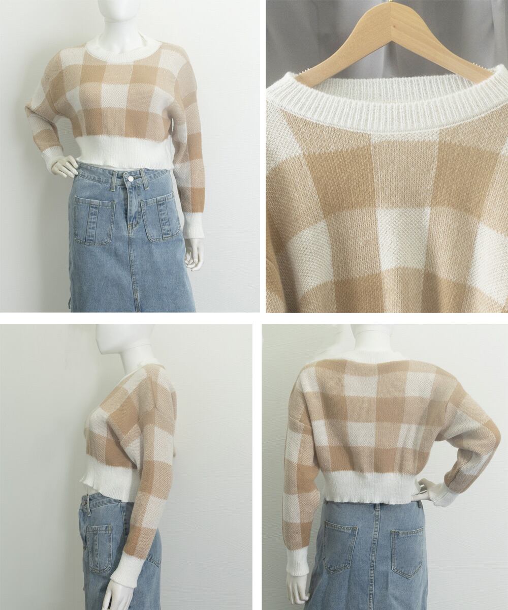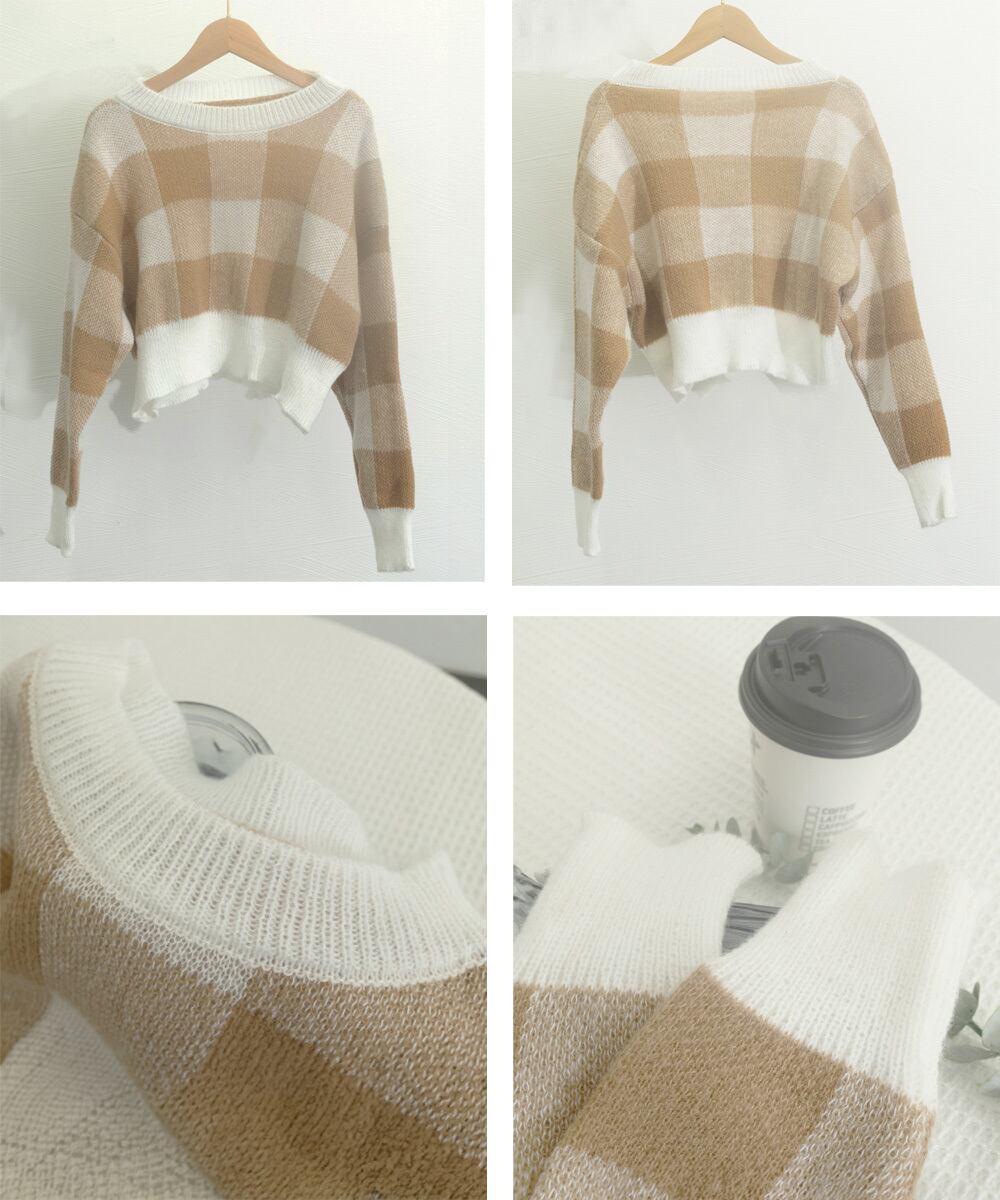 ブロックチェック 韓国風 ニット ラウンドネック プルーオーバー ニットトップス 通学 ニットソー 大人カジュアル