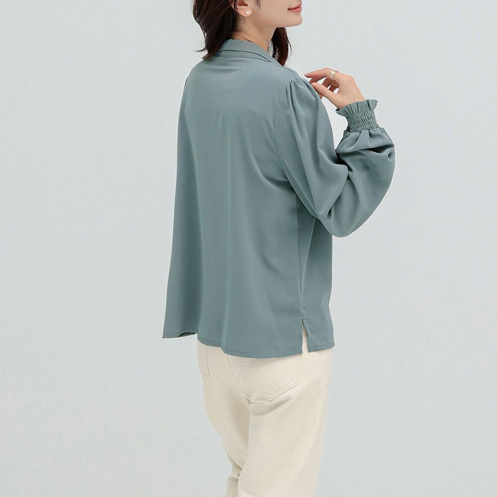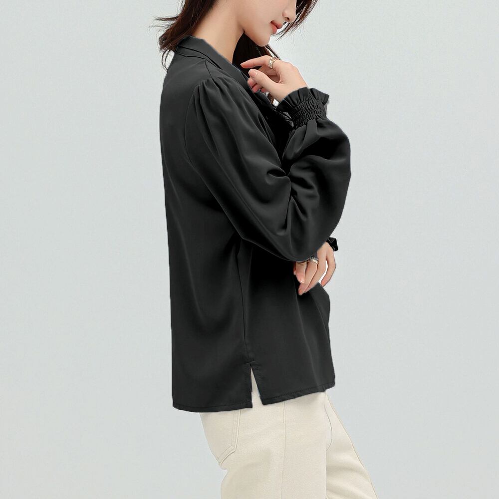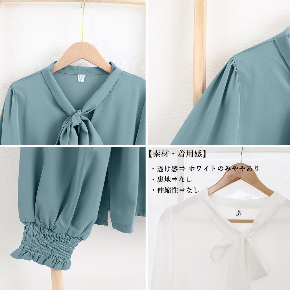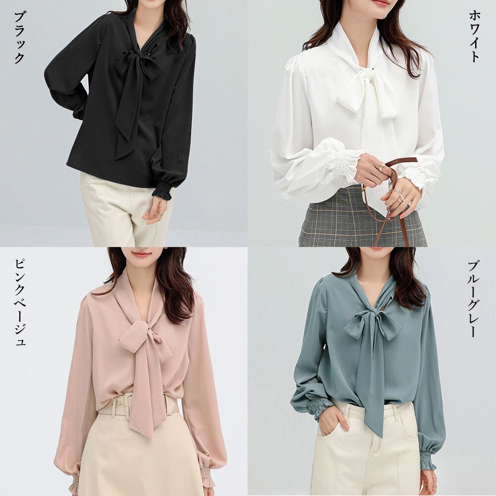 タイリボン 長袖 シャツブラウス タイネック 大人女性 無地 パフスリーブ 通勤 就活 着やせ 韓国 春夏服 きれいめ