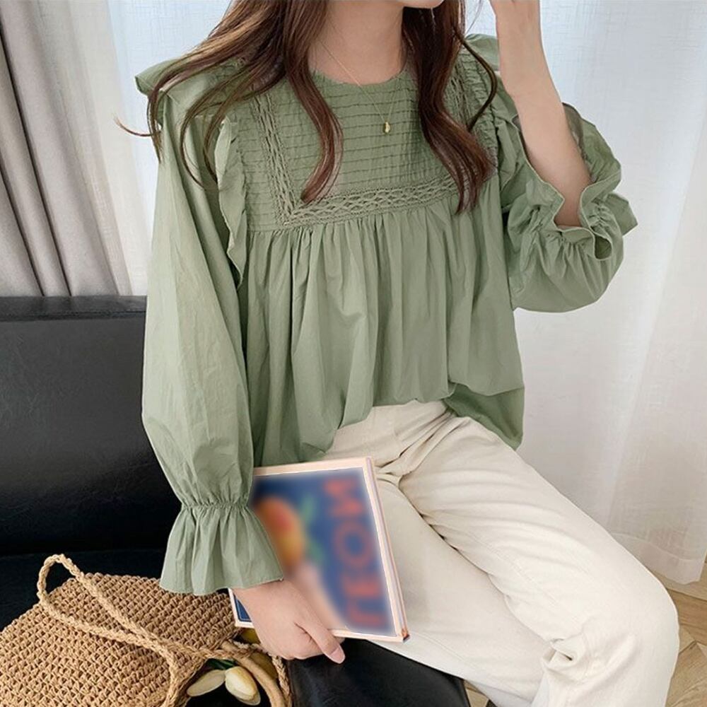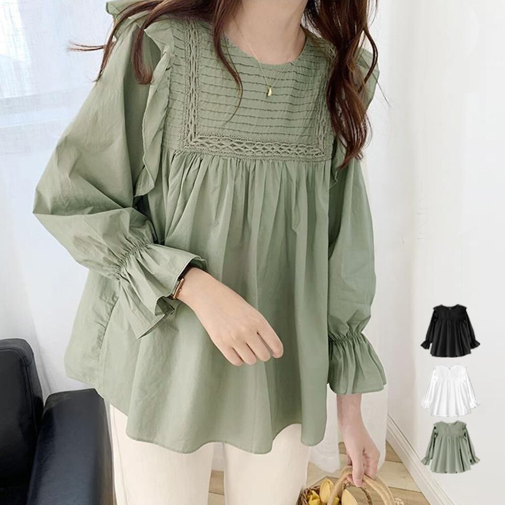 ラッフルショルダー ぽわん袖 ブラウス ラウンドネック夏服