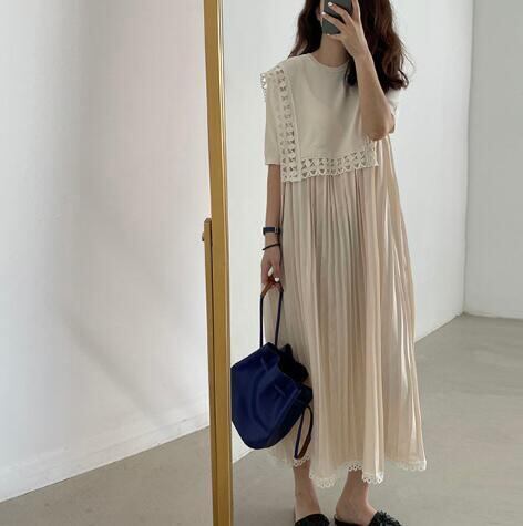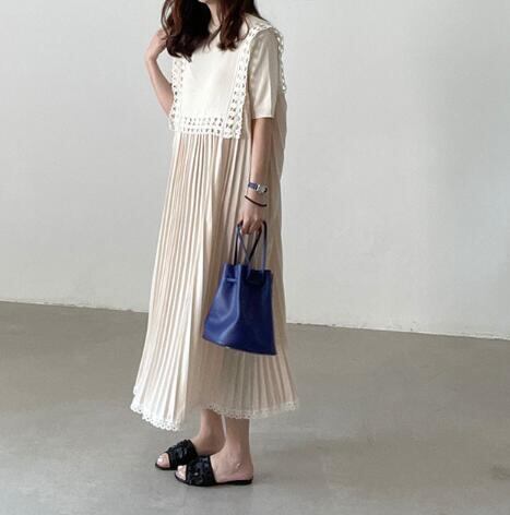 ファッション トップス レディース ワンピース フレンチ風 クルーネック ドッキング プリーツスカート