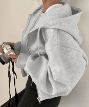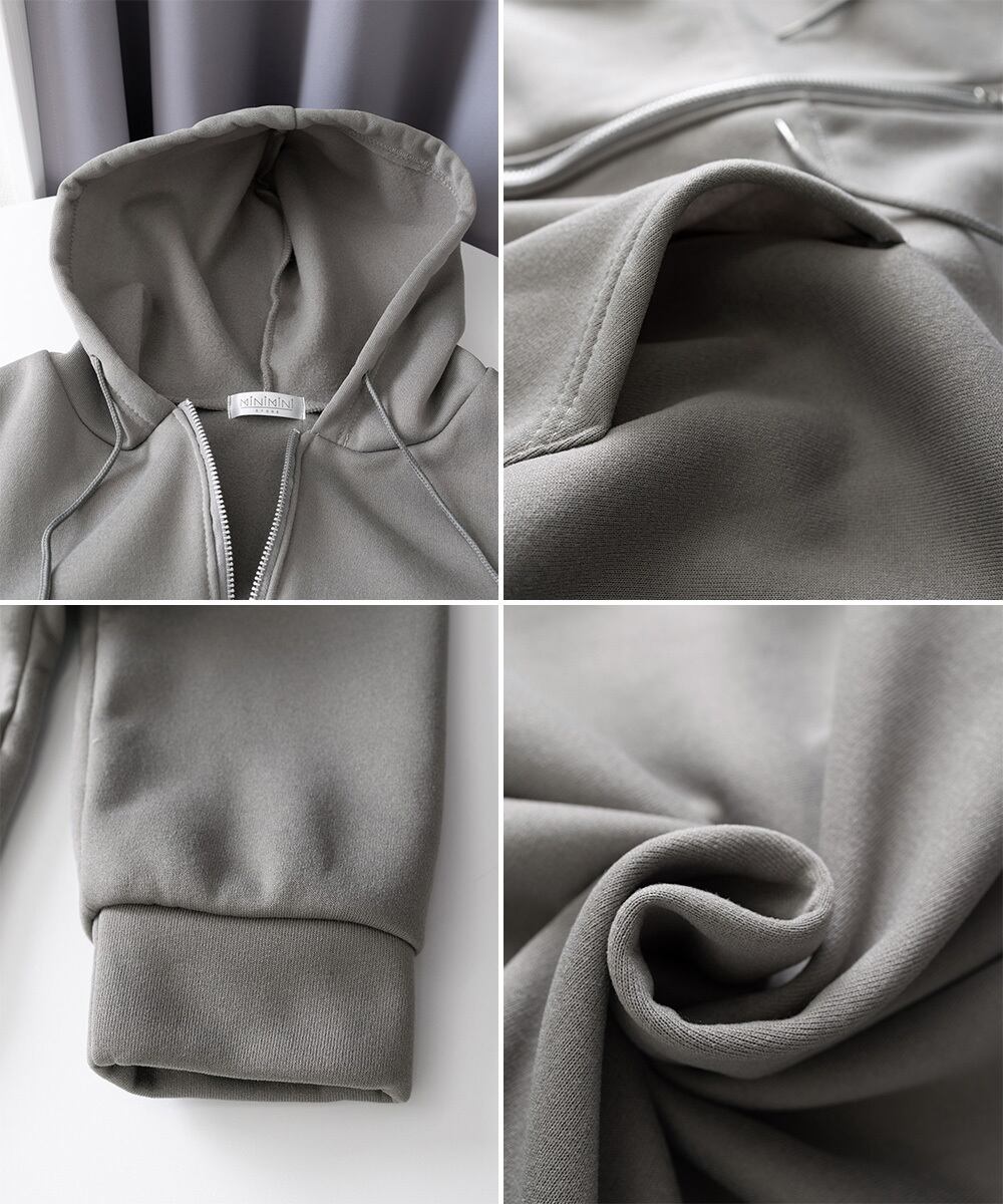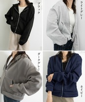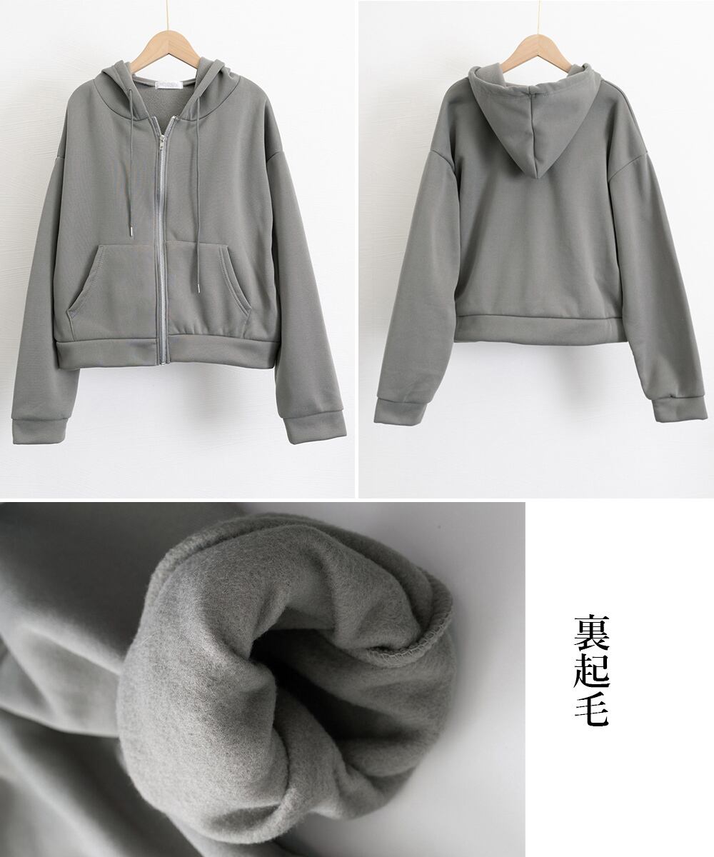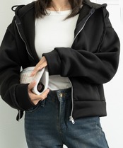 ふくらみ感が魅力のフード付きショート丈ジップアップパーカー