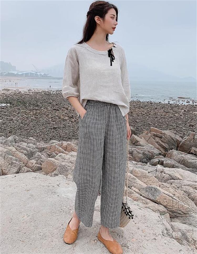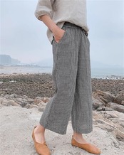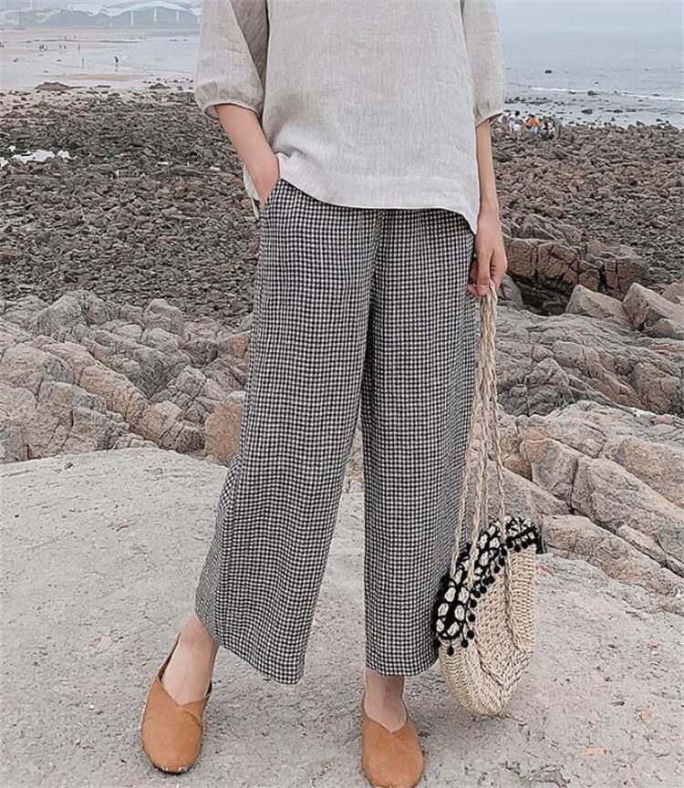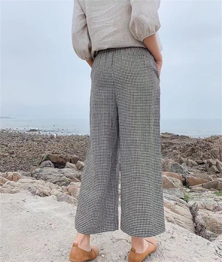九分丈パンツ カジュアル 格子縞 リネン スラックス 快適である ワイドパンツ