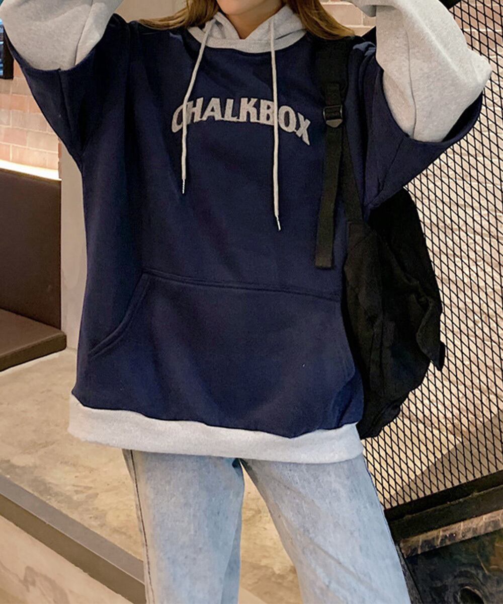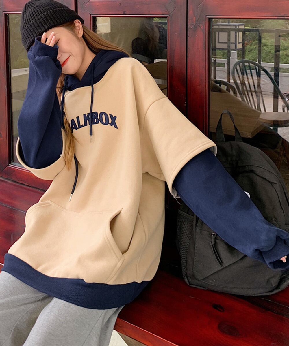 韓国風 フーディー フード付き スウェットトレーナー バイカラー 暖かいプルオーバー ゆったりロングパーカー おしゃれ