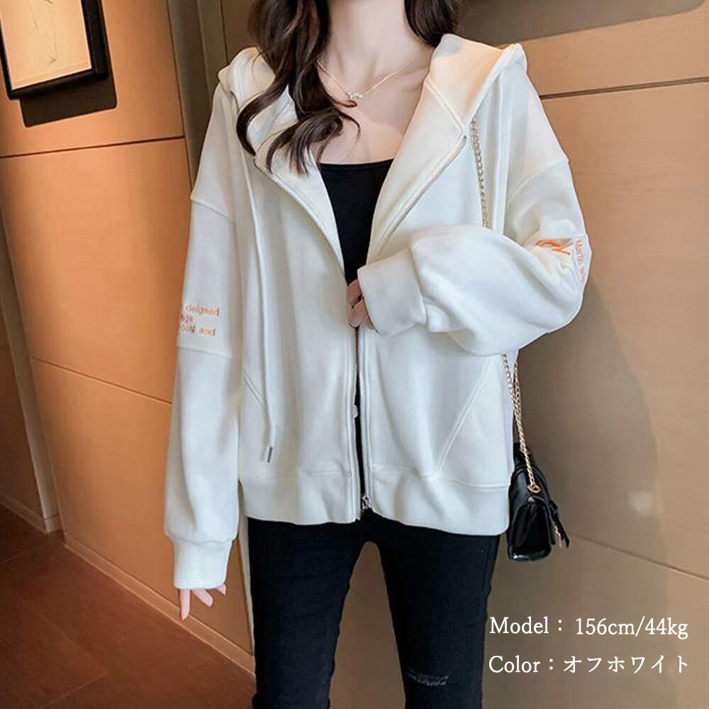 カジュアル ロゴ刺しゅう ジップパーカー 体型カバー フード付き 長袖スウェット おしゃれ ジップアップトレーナー着やせ