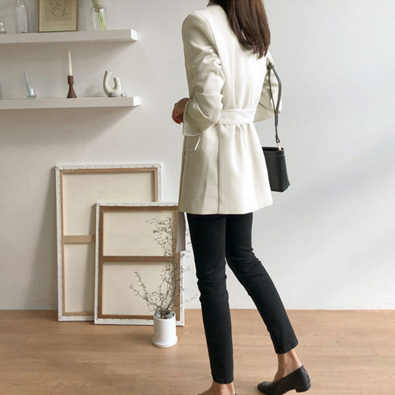 スーツジャケット ベルト付き ボタンレスジャケット ポケット付き オフィス ミディアム丈軽アウター 裏地付き 体型カバー