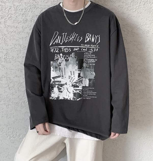 メンズ 男 カジュアル 長袖 丸首 プリント トップス Tシャツ インナー M-5XL