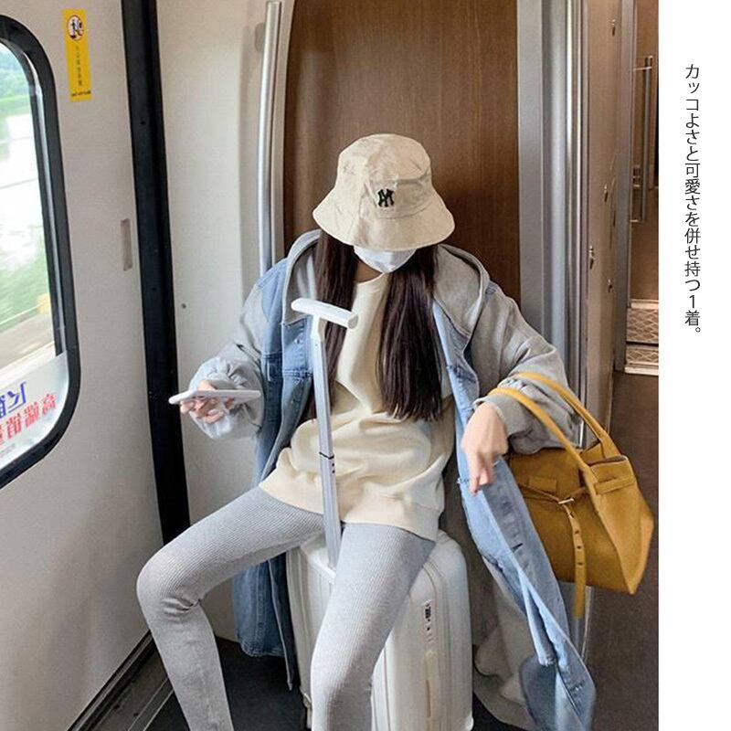 秋冬新作 レディース デニム 重ね着風 ロング丈 フード ゆったり フード アウター コート 異素材