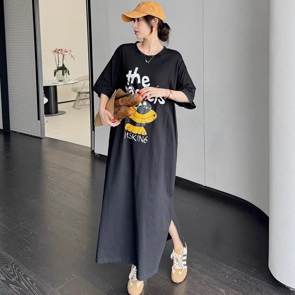 大きいサイズ春夏新作 韓国 レディース ファッション プリント Tシャツ ワンピースLL-4L